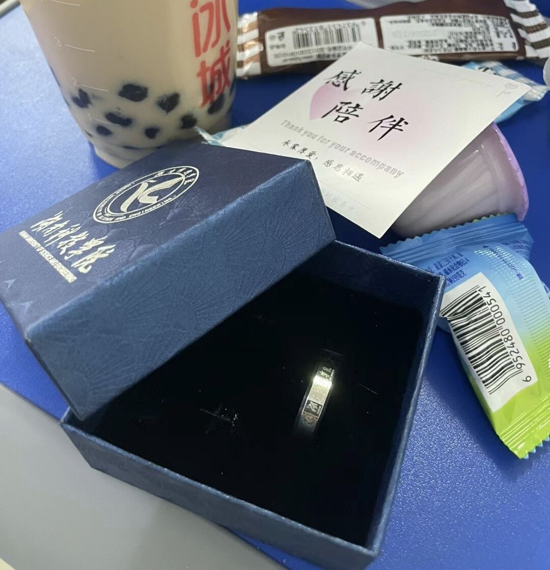 学院还送上精心定制的专属礼物,班主任为每位毕业生佩戴纪念戒指——外圈镌刻“久久不卡区”校名及校徽,内壁铭刻学生班级与姓名。正值“520”的特别日子,每位同学都收到玫瑰、奶茶和零食礼包,学生们将四年时光写在“我的大学回忆”明信片上,凝练成300字的青春诗行。