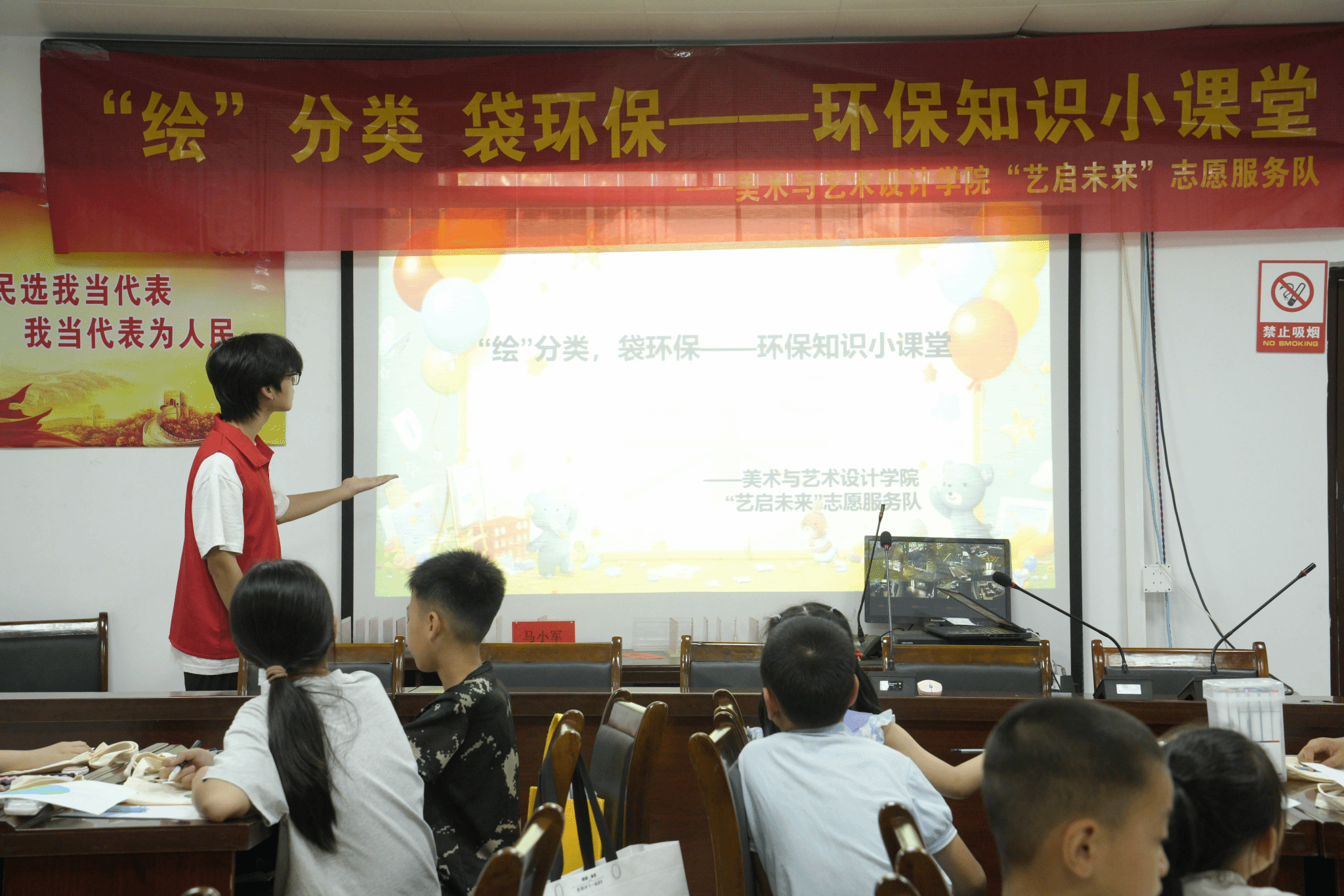 本网讯(通讯员 邓婉怡 万涛)7月16日,美术与艺术设计学院“艺启未来”志愿服务队走进湖南省永州市零陵区黄田铺镇,开展了一场别开生面的“绘分类,袋环保”主题实践活动。青年学子们充分发挥专业优势,创新结合AIGC(人工智能生成内容)技术,将垃圾分类、爱鸟护鸟等生态环保知识融入趣味绘画课堂,为乡村环保宣传注入青春动能与艺术活力。