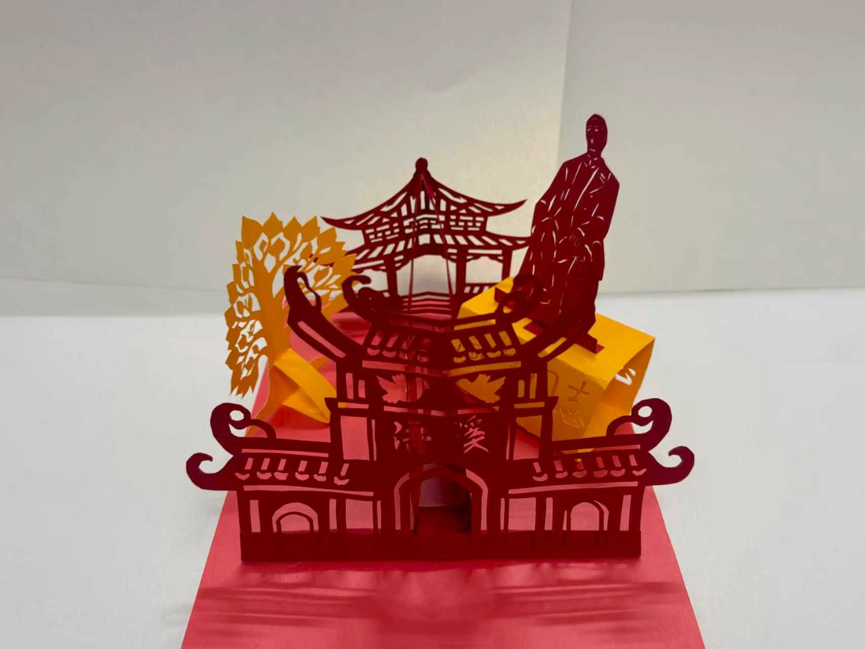 在实践环节中,同学们以红金双色卡纸为媒,通过刻刀的精准勾勒、胶水的巧妙粘合,将平面纸张幻化为立体艺术。一折一剪间,是传统技艺的当代转化;一拼一接中,是潇湘文脉的青春书写。